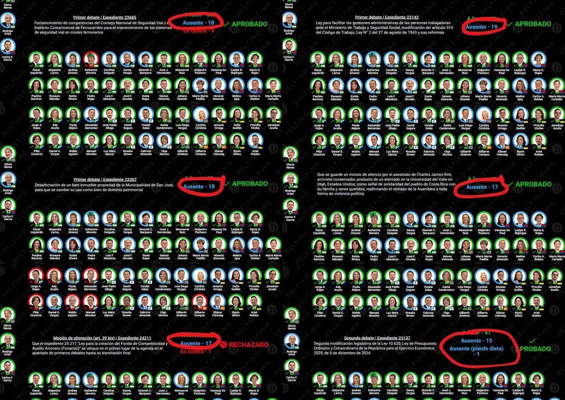 En la imagen adjunta se pueden ver 10 votaciones realizadas en distintos días del mes de septiembre en la Asamblea Legislativa. Hay que agradecer el trabajo de Barra de Prensa de Delfino.cr que permite ver estos datos con tanta facilidad. Son votaciones en varios días, sobre distintos temas y con resultados diversos. Pero muestran un patrón preocupante: en promedio, 16 diputados estuvieron ausentes en cada una de esas votaciones.